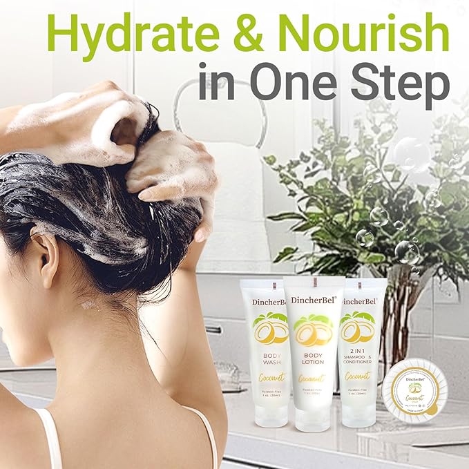 - SUSTAINABLE, CRUELTY-FREE: DincherBel mini shampoo and conditioner sets do not contain paraben or irritable additives to the skin. Never tested on animals, our toiletries are packaged in safe wraps that won’t fill landfills or affect wildlife