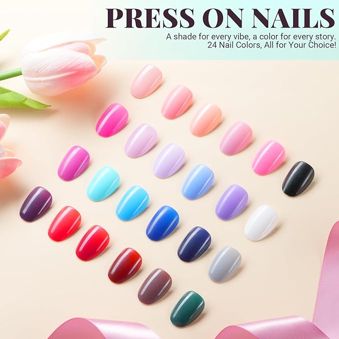 - Short Oval Press on Nails: Fake nail kits with 720pcs short oval nails(24 colors), 10g false nail tips glue, 5 sheets for 120pcs adhesive nail tabs, 2 Sheets stickers, 2pcs nail files 100/180, and 2pcs cuticle pushers and 1pcs pick up tweezer. Includes all the necessary nail art DIY tools you need. It is suitable for beginners and home users, and perfect for both professionals and amateurs