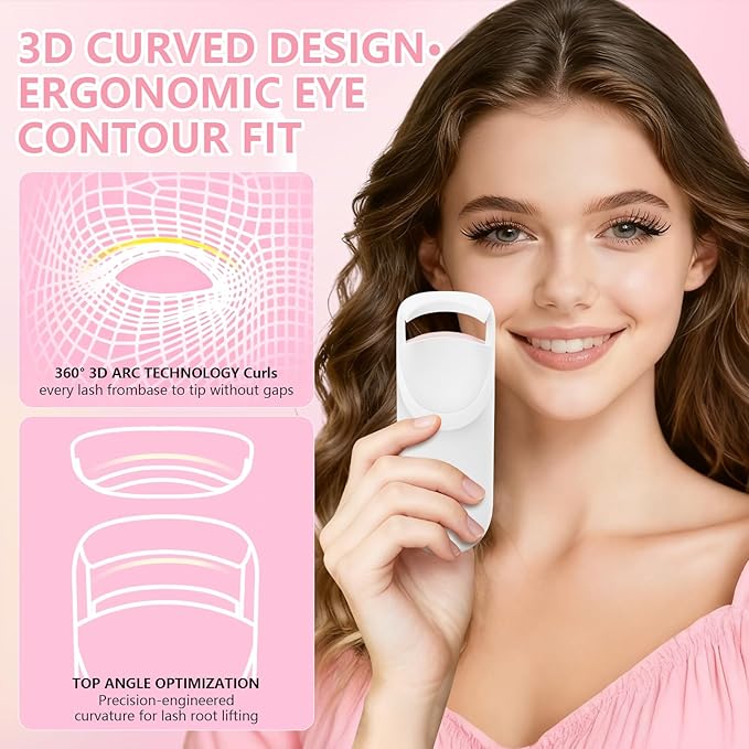 - 【3D Curved Design, Ergonomic Eye Contour Fit】With its ergonomic 3D curved design, this heated lash curler perfectly contours to the shape of your eyes. It is easy to reach all of your little lashes, from the inner corner to the outer, ensuring even heating and a uniform, seamless curl without pinching your eyelids.