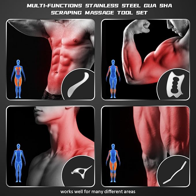 - Whole Body Muscle Scraper Tool** - Our 4-in-1 Stainless Steel Muscle Scraper Tool set applied to whole body relief (face, back, legs, wrists, arms, necks, and shoulders) help muscle pain relief , soreness and tension, soft tissue adhesion and fascia limitation, improve lymphatic drainage break, promote blood circulation, enhance skin elasticity and tightness.