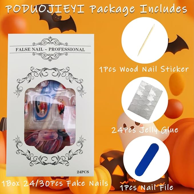 - False Nails Sets: Our Halloween fake nails is exquisite and beautiful. It contains 24pcs short oval press on nails and a set of DIY nail art tools. There are 12 different sizes of fake nails. You can choose the most suitable fake nails for yourself.