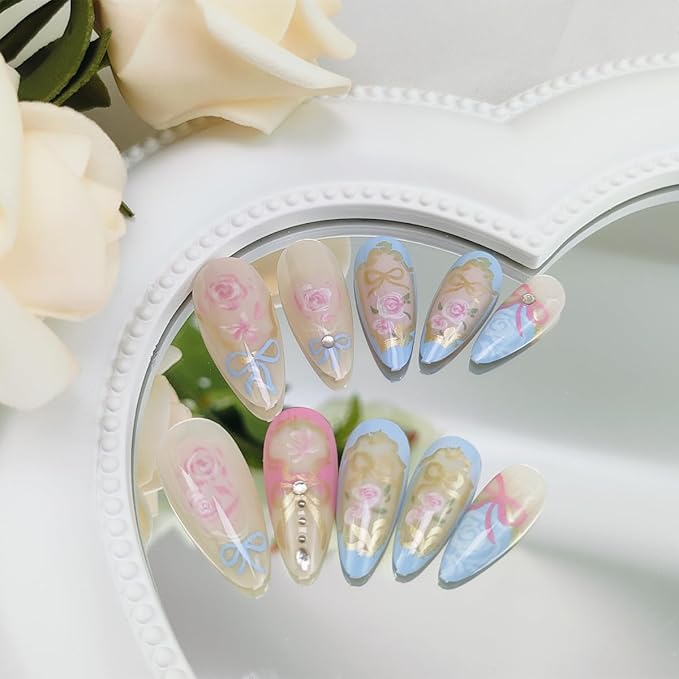 24Pcs Pink Flower Press on Nails Medium Almond Fake Nail Cute Bow with Rhinestones Designs Glue on Nails Rose Flowers Acrylic Nail Pink Blue Full Cover False Nails for Women Daily Wear