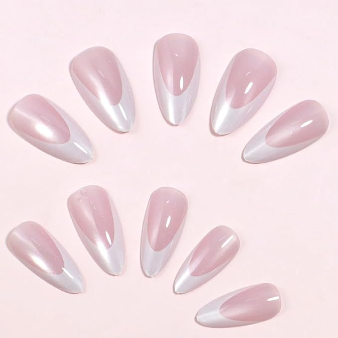 French Tip Press on Nails Medium Almond Fake Nails Cat Eye Chrome False Nails Press ons Glossy Pink Glue on Acrylic Nails for Women Manicure Deco 24Pcs