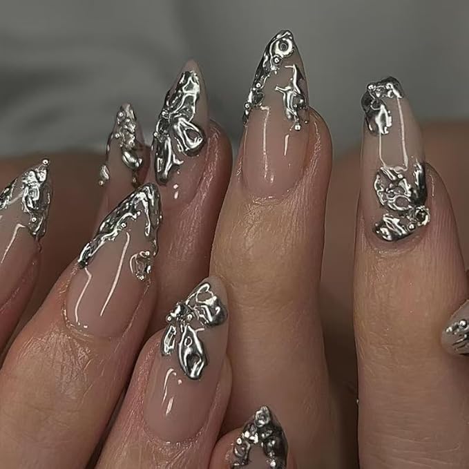 Almond Press on Nails Silver Fake Nails French Tip False Nails Press ons 3D Silver Chrome Design Glue on Acrylic Nails for Women Manicure Art Decoration 24Pcs