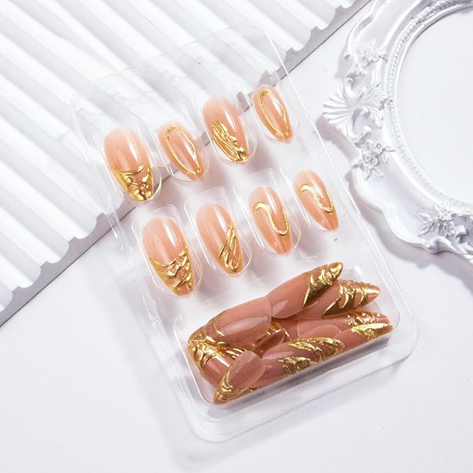 - Safe and Sturdy Design: Unique micro-thickening design to prevent 3D gold almond fake nails tips from cracking, Manual brush gel treatment on the nail surface, pattern printing is clear and not easy to fade, providing you with a safe and comfortable nail experience.