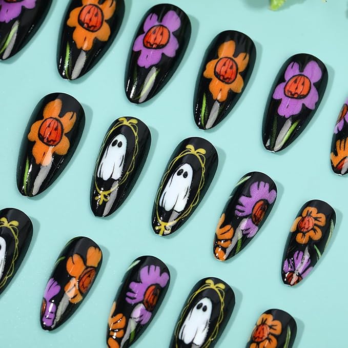 24Pcs Halloween Press on Nails Medium Almond Fake Nails Spooky Graffiti Skull Flower Ghost Design Full Cover Glitter Stick on Nails Dark Black False Nails for Women Acrylic Holiday Nail Decorations