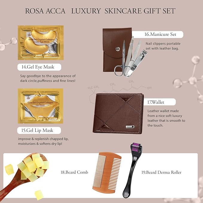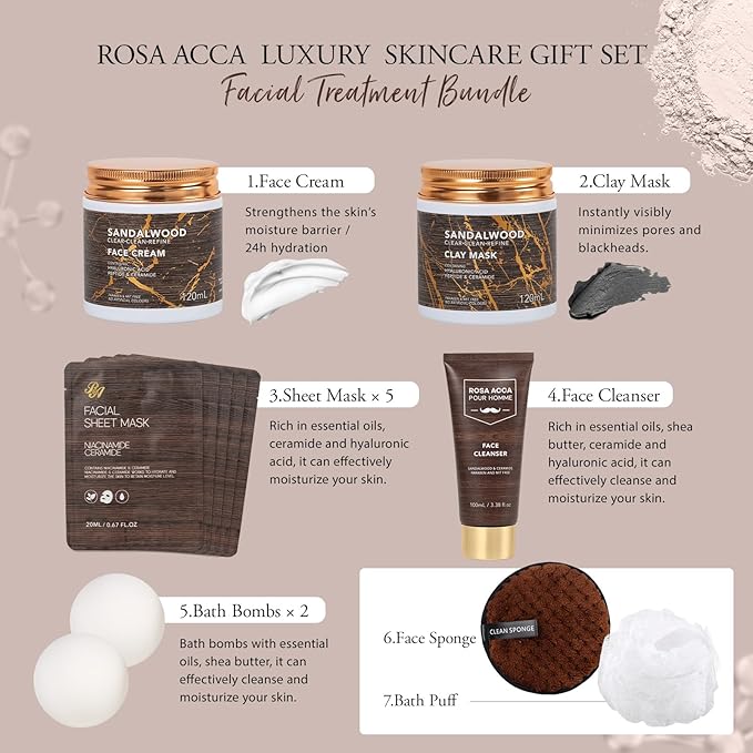 - 30 Pcs Advanced Skin Care Set: This complete gift set contains premium essential oil facial skin care products with 120ml face cream, 120ml clay mask, 5 pcs face sheet mask, gel under patches, gel lip mask, 30ml face serum, 20ml face oil, 20ml beard oil, 20ml bath oil, 50g *2 bath bombs, 50ml perfume, face clean sponge, nail clipper set, wallet, bath puff, beard comb, bath glove, massage roller