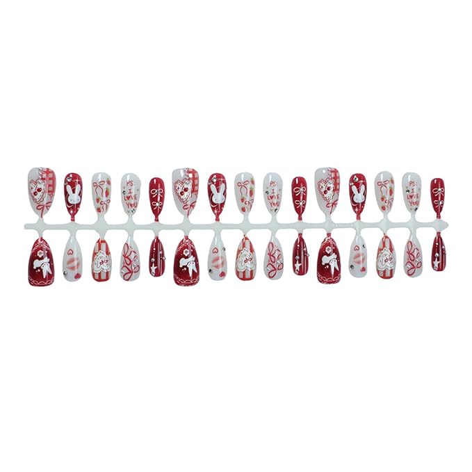 30Pcs Almond Press on Nails Medium French Fake Nails with Bow Cartoon Rabbit Design Rhinestone Pearl False Nails Heart Red Lips Stick on Nails Manicure Fingernail Handmade Nail for Women DIY