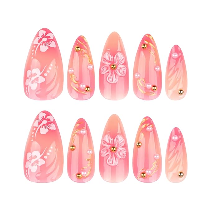 24Pcs Cute Flower Press on Nails Almond Medium Fake Nails with 3D Floral Gold Beads Design Pink False Nail Tips Glossy Glue on Nail Summer Full Cover Acrylic Stick on Nail for Women