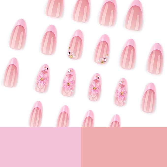 3D Pink Flower Press on Nails French Tip Medium Almond Fake Nails with Pearl Rhinestone Designs Glossy Acrylic False Nail Tips Full Cover Artificial Glue on Nails for Women Manicure Kit