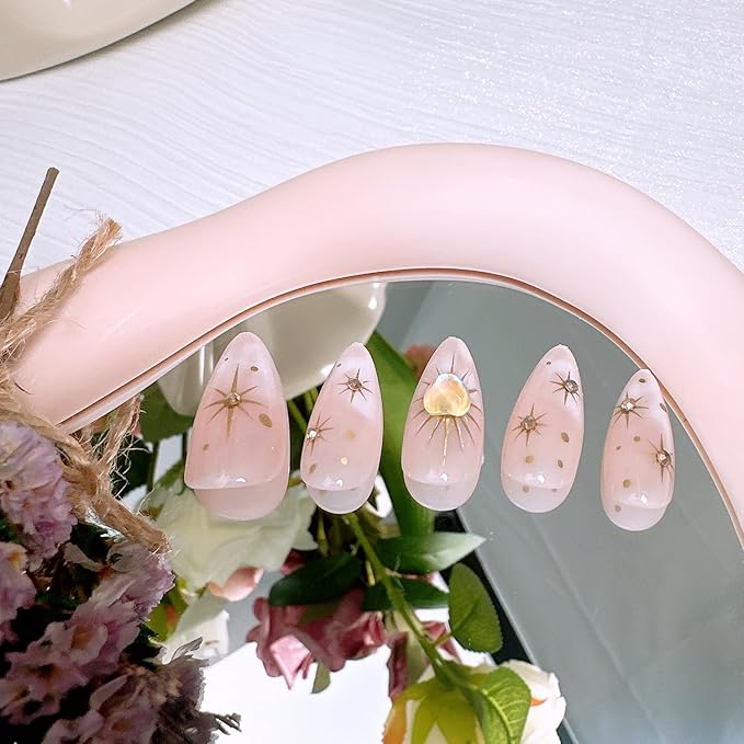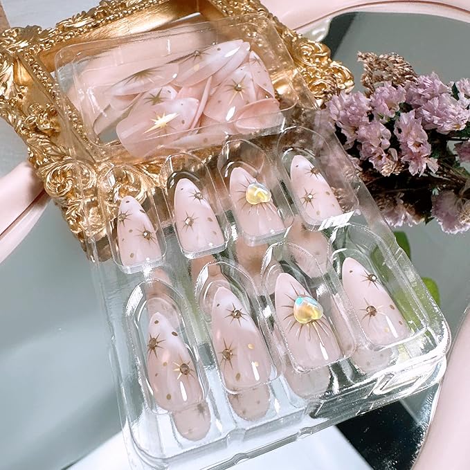 24Pcs Almond Press on Nails Medium Length Gold Star Fake Nails with Heart Diamond Designs Full Cover Nude Gradient Acrylic Nail Sun Stars False Nail Rhinestones Stick on Nails for Women