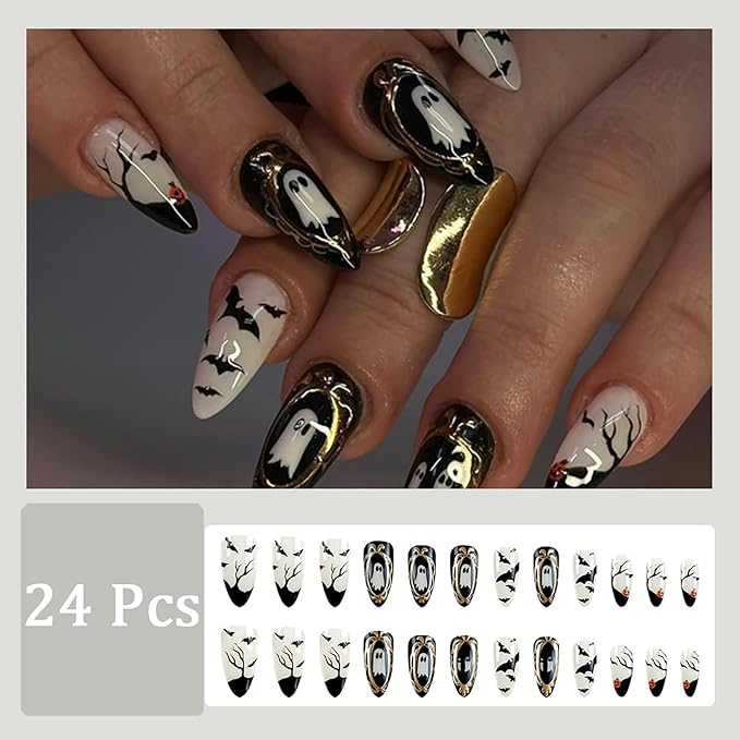 24Pcs Halloween Press on Nails Medium Almond Fake Nails Horror Bat Acrylic Nails with Glossy Scary Pumpkin Ghost Stick on Nails Full Cover Holiday False Nail Tips for Women Manicure Nail Decoration