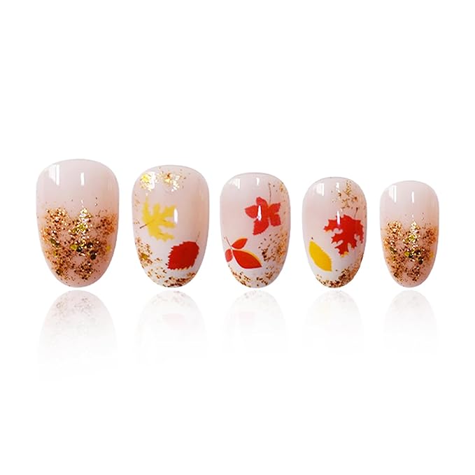 24Pcs Fall Press on Nails Short Oval Fake Nails with Gold Glitter Yellow Red Maple Leaf False Nail Reusable Thanksgiving Acrylic Nails Full Cover Autumn Maple Leaves Stick on Nail for Women Nail Art