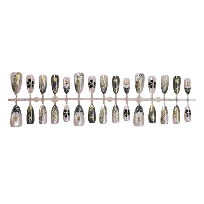 - Package Contains: Our gold leaf press on nails designs gold french tip false nails is exquisite and beautiful. It contains 24 pcs medium almond fake nails and a set of DIY nail art tools. There are 12 different sizes of fake nails. You can choose the most suitable gold star fake nails for yourself.