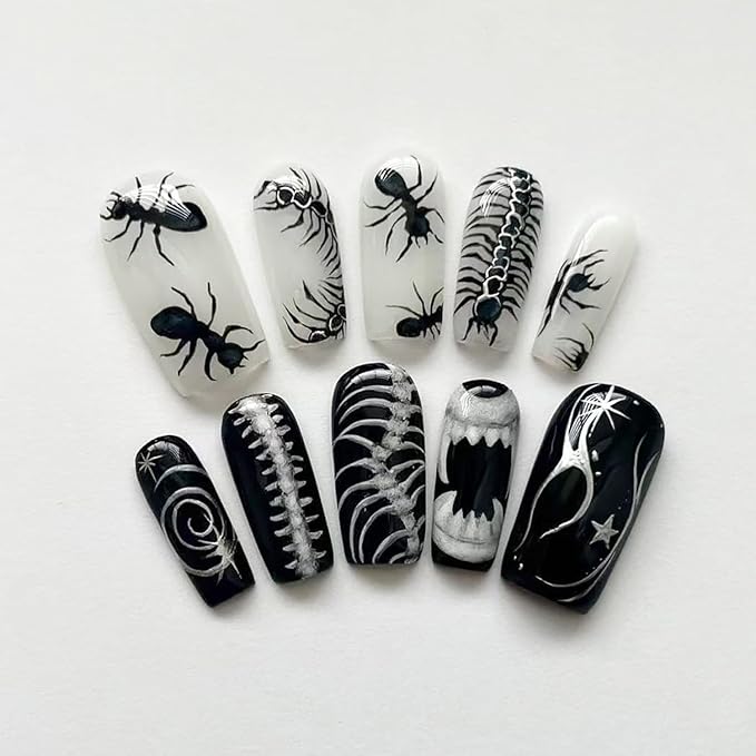 - Package Contains: Our halloween press on nails designs ant centipede spine false nails is exquisite and beautiful. It contains 24 pcs long square fake nails and a set of DIY nail art tools. There are 12 different sizes of fake nails. You can choose the most suitable black and white fake nails for yourself.