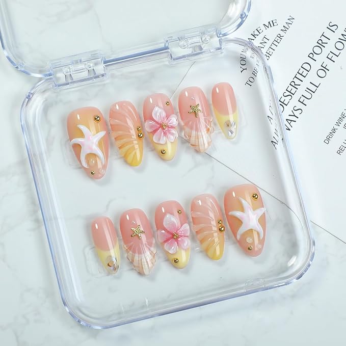 - Package Contains: Our yellow flower press on nails designs summer beach false nails is exquisite and beautiful. It contains 24 pcs medium almond fake nails and a set of DIY nail art tools. There are 12 different sizes of fake nails. You can choose the most suitable gold starfish fake nails for yourself.