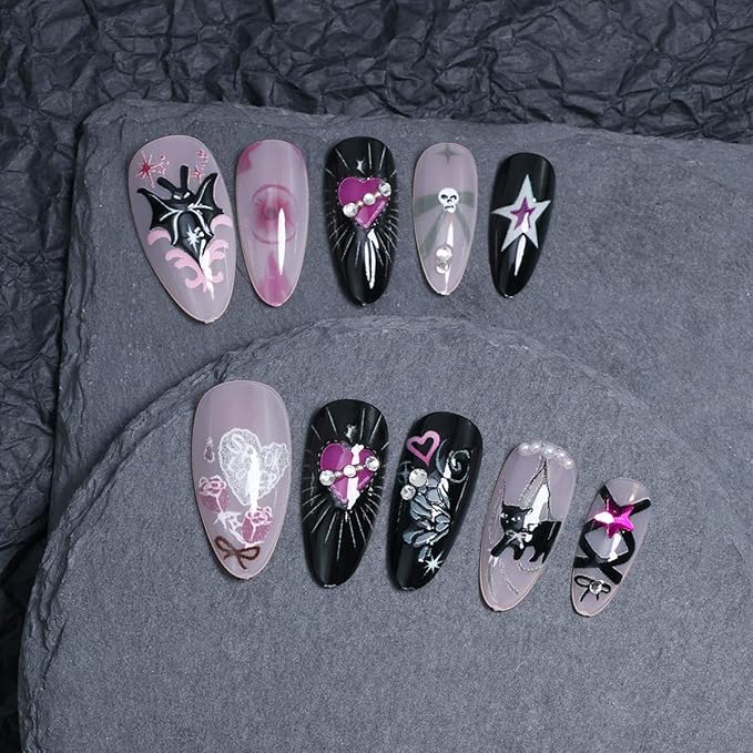 24Pcs Gothic Press on Nails Medium Almond Fake Nails Black Cat Bow Heart with Rhinestones Gems Y2k Glitter Design Full Cover Y2k Glue on Nail Halloween False Nails for Women Artificial Acrylic Nails