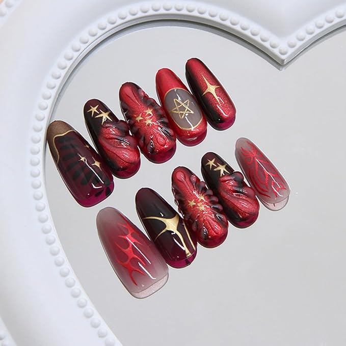 - Halloween False Nails: Made with quality materials, our set of 24 medium almond fake nails feature a trendy red acrylic nails design in glossy,give 24 pcs jelly gel 1 wooden stick 1 nail file perfect for manicure decoration