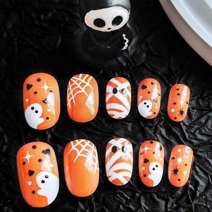 24Pcs Halloween Press on Nails Short Fake Nails Glossy Orange False Nails with Cute Ghost Spider Web Mummy Design Full Cover Artificial Glue on Nails Star Heart Stick on Nail for Women Acrylic Nail