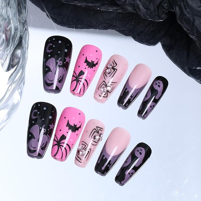 - Halloween False Nails: Made with quality materials, our set of 24 pink pumpkin fake nails feature a trendy spider web acrylic nails design in glossy,give 24 pcs jelly gel 1 wooden stick 1 nail file perfect for manicure decoration