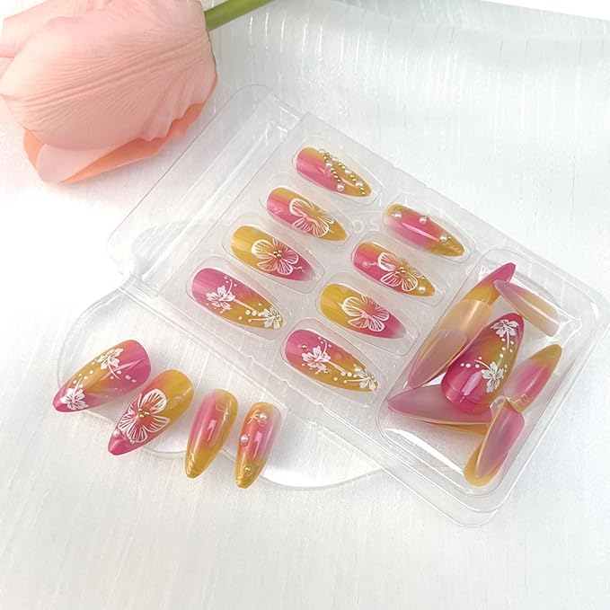 - Press on Nails:Long almond press on nails combined with flower design style, giving you beautiful nails and a different good mood