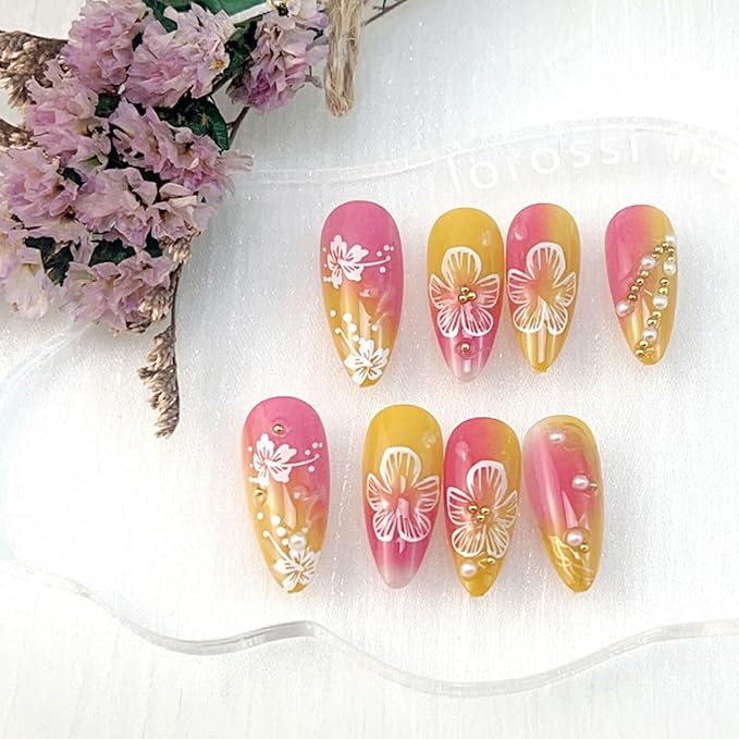 Flower Press on Nails Long Almond Fake Nails Orange Pink Gradient False Nails White 3D Floral with Gold Rhinestone Design Pearl Full Cover Glue on Nail for Women Decoration Manicure Kit