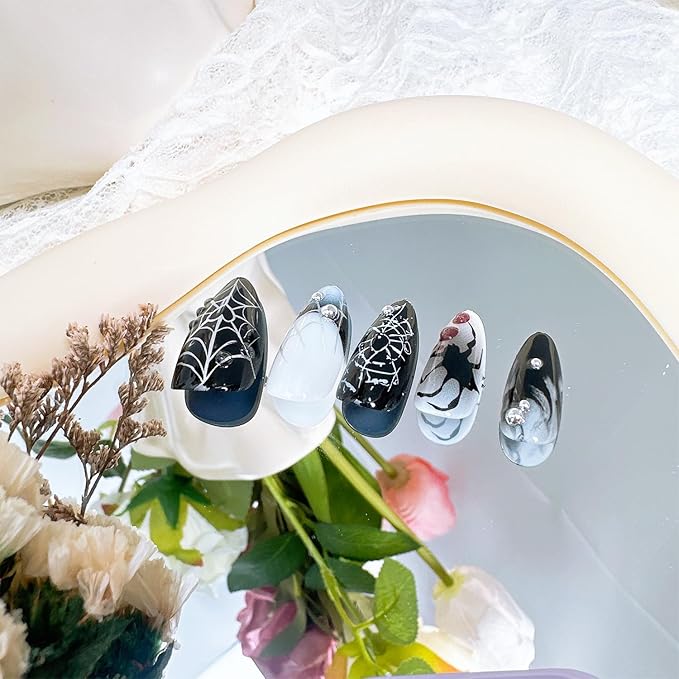 - Halloween Kit for Nails: Each set includes 24pcs Almond press on nails medium, 24pcs adhesive nails tabs, 1 wooden stick, and 1 nail file. Everything you need for a salon-quality manicure at home