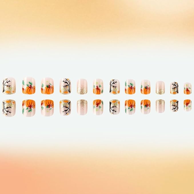 - Press on Nails:short square press on nails combined with pumpkin and gold glitter , giving you beautiful halloween nails and a different good mood