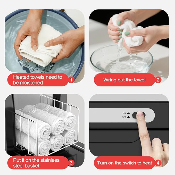 - 【Easy to Use】The towel heating machine is easy to operate. First, wet the towels with warm water and wring them out. Next, put them in the heater and turn on the switch. Then you just need to wait and remove the towels with anti-scald tongs at last.