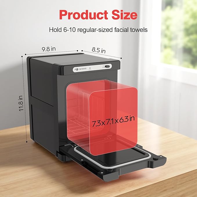 - 【Suitable Capacity】Our towel heater effectively saves space with a size of 8.5 x 9.8 x 11.8 inches. Simultaneously, It has a 5L capacity of 6-8 regular size towels, allowing you to put enough towels in it at once for both small business and home use.