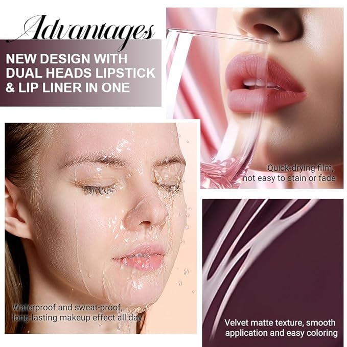 - 2 IN 1 Lip Liner & Matte Liquid Lipstick: The double ended design made you can use lipstick and lip liner on both ends. New design with dual heads lipstick & lip liner in one, for draw delicate lip line before applying lipstick. It combines lip line and metallic lipstick and makes double-end lipstick more perfect,meets the need of all occasions.