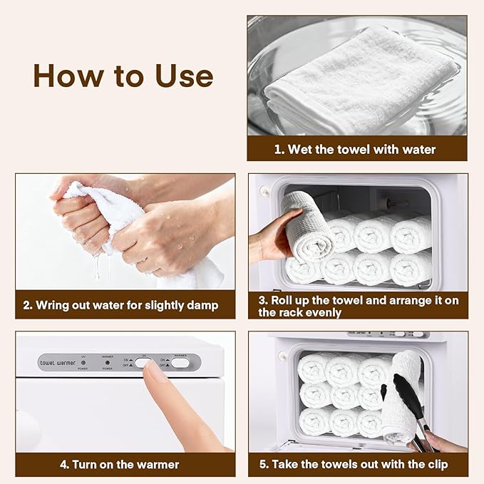 - Easy to Use: Wet the rolled towel with warm water, wring out the excess water and put it in the hot towel warmer. Press the heating button. After 30 minutes, you can enjoy a clean and warm towel experience. It's recommended to minimize frequent door openings during the process for better warm results