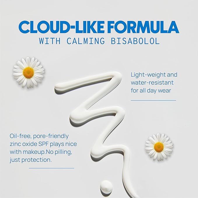 - CLOUD-LIKE FORMULA WITH CALMING BISABOL - This seamless sunscreen disappears as fast as last week’s hookup. Oil-free zinc oxide is a pore-friendly formula that doesn't pill under makeup. Water-resistant all-screen perfect as daily SPF with cloud-like feel.