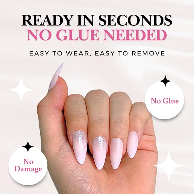 - NO GLUE, NO MESS, NO DAMAGE: No Damage: Say goodbye to painful removals and nail damage. Chemical-free adhesive tabs keep your nails secure and flawless all day without damaging your natural nails.