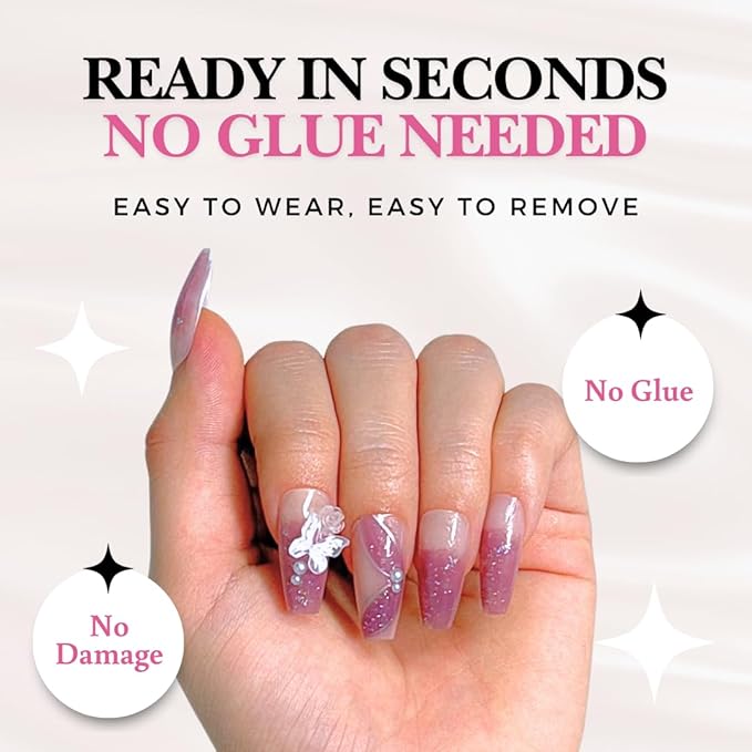 - NO GLUE, NO MESS, NO DAMAGE: No Damage: Say goodbye to painful removals and nail damage. Chemical-free adhesive tabs keep your nails secure and flawless all day without damaging your natural nails.