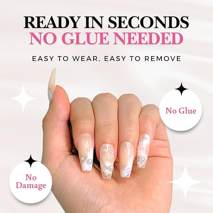 - NO GLUE, NO MESS, NO DAMAGE: No Damage: Say goodbye to painful removals and nail damage. Chemical-free adhesive tabs keep your nails secure and flawless all day without damaging your natural nails.