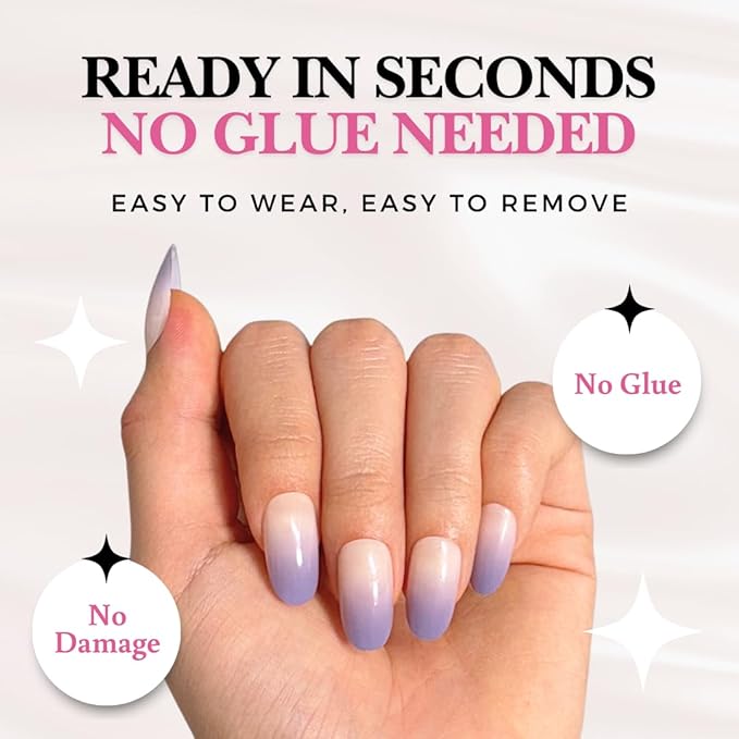 Perfect Look Press On Nails - Lavender Mist | No Glue One-Day Short Oval Nails, Nude to Purple Ombre Glossy Nails - 24 Pcs Nail Kit with Adhesive Tabs
