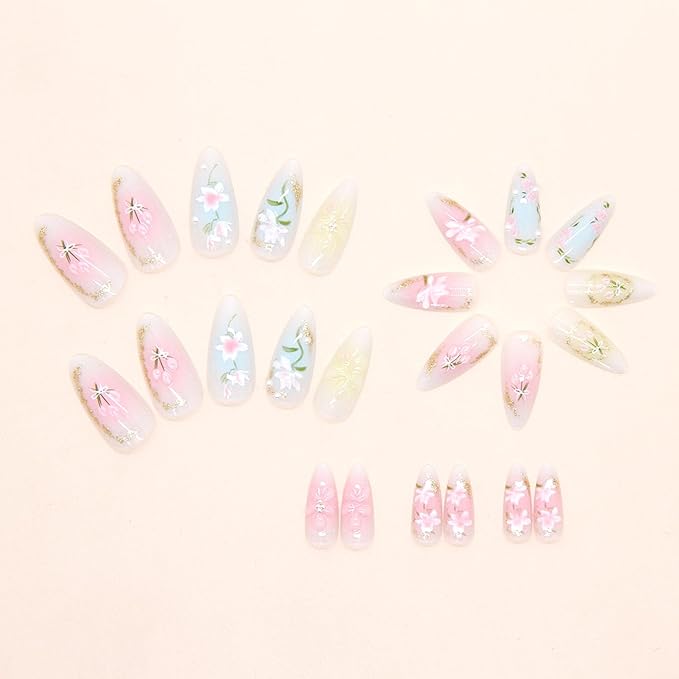 - 3D Nails Set: The package include 24pcs 3d effect almond press on nails & a nail file & 24pcs jelly glue stickers. (Durability of jelly glue sticker is NOT as good as liquid glue, but it makes fake nails reusable. Please use suitable glue according to different scenes)