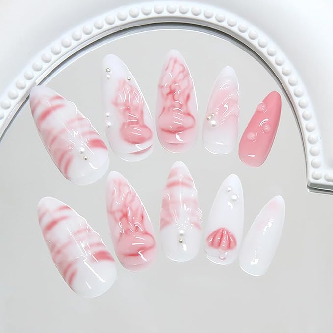 24PCS Summer Press on Nails Almond Fake Nails with 3D Shell Pattern Jellyfish Pearl Press on Fake Nail Full Cover Stick on Nails Handmade Press on Nails Art Decoration for Women