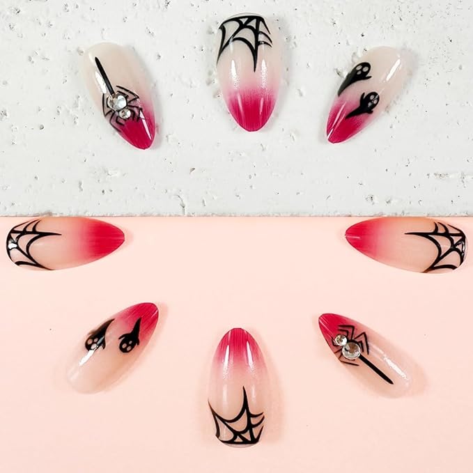 24Pcs Halloween Press on Nails Medium Almond Fake Nails with Spider Star Rhinestones Design Goth Cute Ghost Ghost Acrylic Nails Full Cover Stick on Nails Pink Red Gradient Glue on Nails for Women