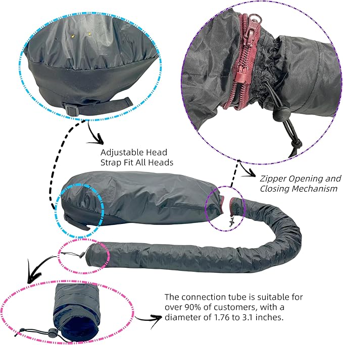 - Detachable Design, Fits 90% of Customers The extra-large, extra-long nylon waterproof tube fits the needs of 90% of blow dryers and diffusers. Avoid the loud noise near your ears from traditional blow dryers. Use the hooded dryer at home to achieve salon-quality natural curls and enjoy a salon-like experience in the comfort of your own space.