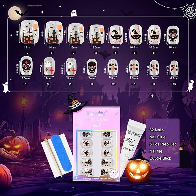 - What You Get: Each halloween nails press on art kit comes with 32 pcs short false nails with 16 sizes,1 nail glue,3 prep pads, 1 nail file, 1 wooden cuticle pusher