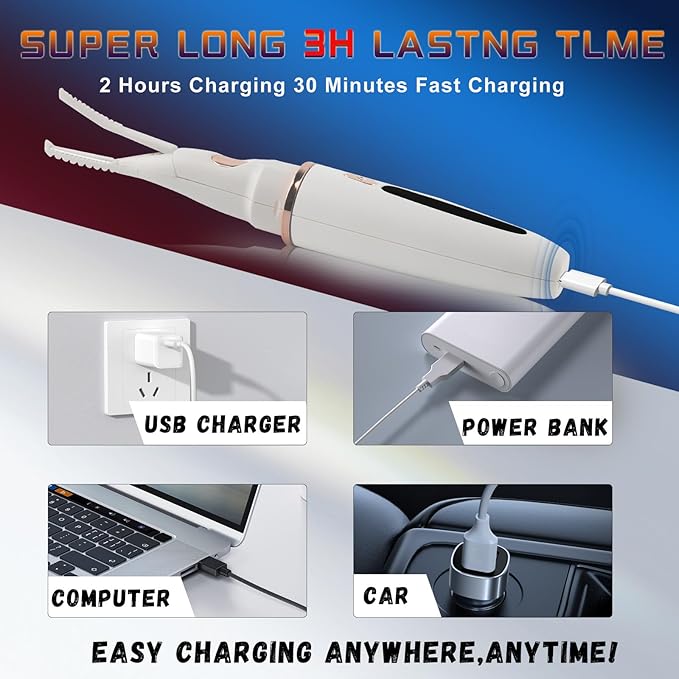 - Type-C Fast Charging and Portable - Type-C rechargeable heated lash curler with slim and compact design makes it ideal for taking on the go. An essential in every girl's makeup pouch. Best gift for women and girls