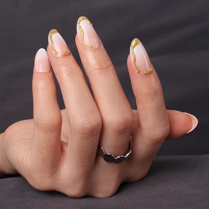 - 【Chic Gradient Design】 – Nude to white ombre base enhanced with elegant 3D metallic gold outlines for a trendy and luxurious look.