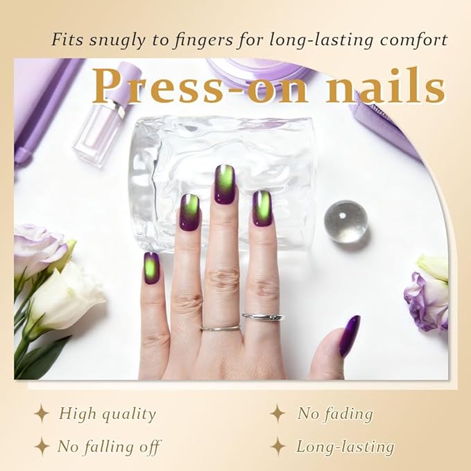 - ✨ Salon-Quality Cat Eye Effect——Achieve a mesmerizing cat eye effect with these press-on nails, featuring a glossy black chrome finish that catches the light beautifully