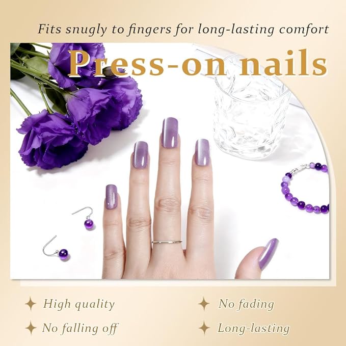 Lavender Purple Cat Eye Press on Nails Medium Square, Medium Square Press Glue on Nails Chrome for Women, Purple Holographic Glitter Glossy Reusable Gel Acrylic Fake Nail with Design Cateye Effect