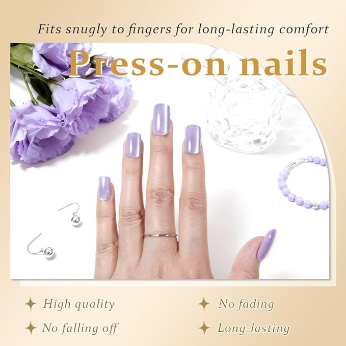 Orchid Purple Cat Eye Press on Nails Medium Square, Medium Square Press Glue on Nails Chrome for Women Gift, Orchid Holographic Glitter Glossy Reusable Gel Acrylic Fake Nail with Designs Cateye Effect