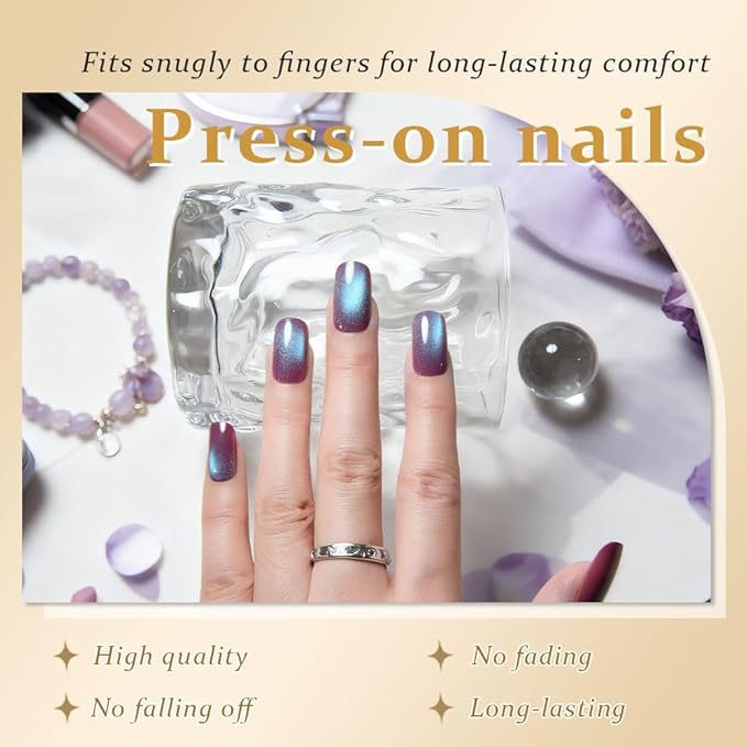 - ✨ Salon-Quality Cat Eye Effect——Achieve a mesmerizing cat eye effect with these press-on nails, featuring a glossy black chrome finish that catches the light beautifully