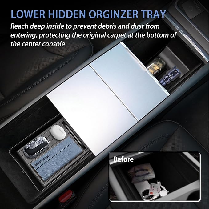- 【Dual-Layer Storage for Maximum Space】Two-tier center console trays create additional storage without compromising accessibility. Keep frequently used items like your phone, keys, or wallet in the upper trays for quick access, while storing less-used or valuable items in the lower layer for a cleaner, more organized interior, making every drive more convenient and enjoyable