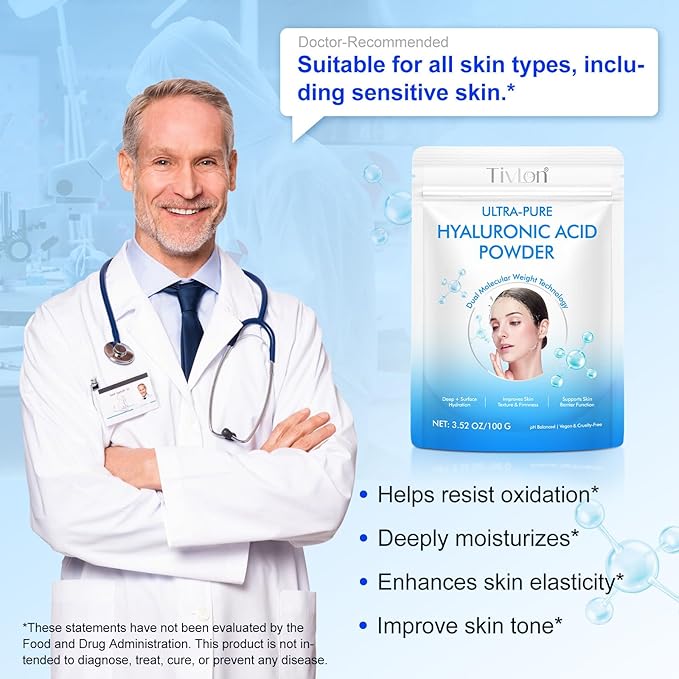 - DEEP HYDRATED & PLUMPER SKIN: Our high-purity hyaluronic acid powder (98%+ pure) features dual molecular weight for optimal absorption, delivering intense moisture deep into your skin and enhances skin elasticity. Say goodbye to dryness, fine lines, and dullness - reveals a dewy, healthy-looking glow!